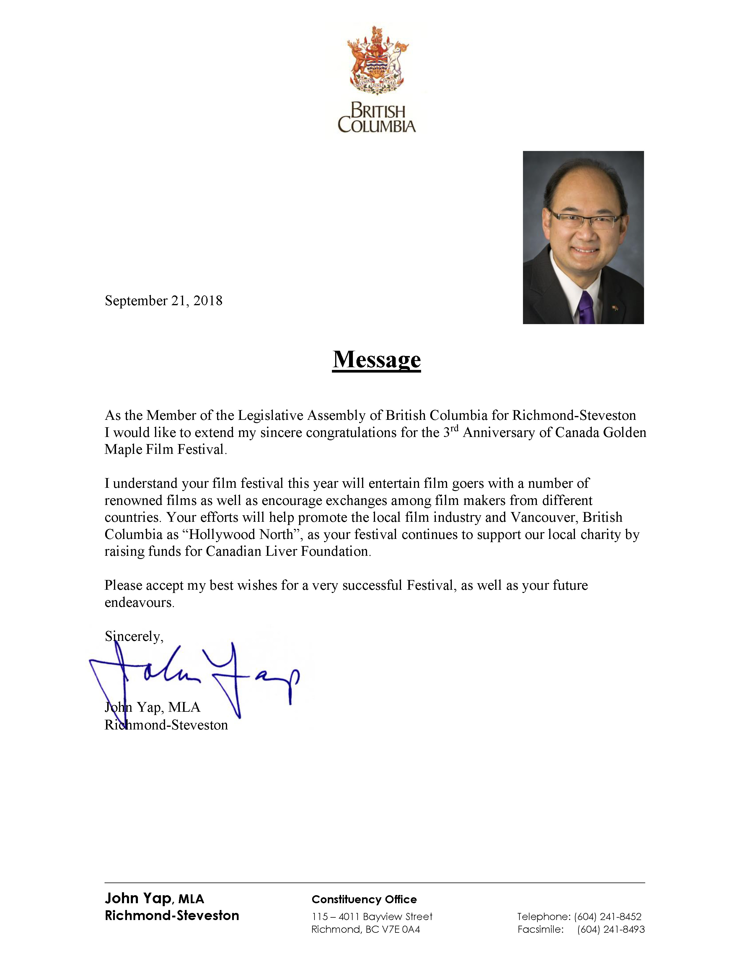 The Canada Golden Maple Film Festival is being held in September every year in British Columbia, Canada, and there will be screenings of outstanding films throughout major city's theaters. The highlights and characteristics of the film festival is to raise awareness on the film industry, culture, media and online network, and to foster the international development of the film industry.