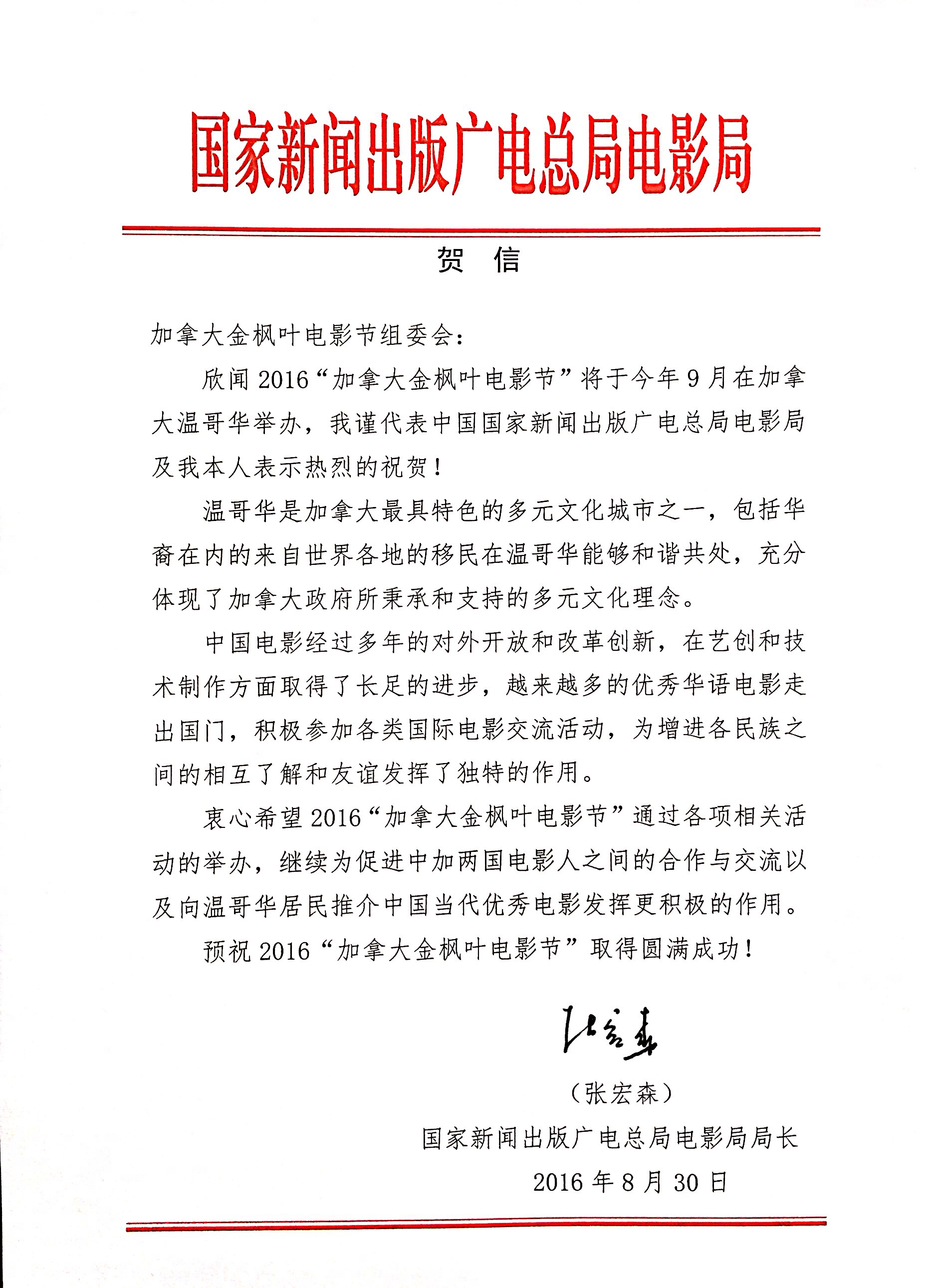 On the occasion of the opening of the first Canada Golden Maple Film Festival, I wish to extend, on behalf of the SAPPRFT (The State Administration of Press, Publication, Radio, Film and Television), warm congratulation to the opening of the forum.