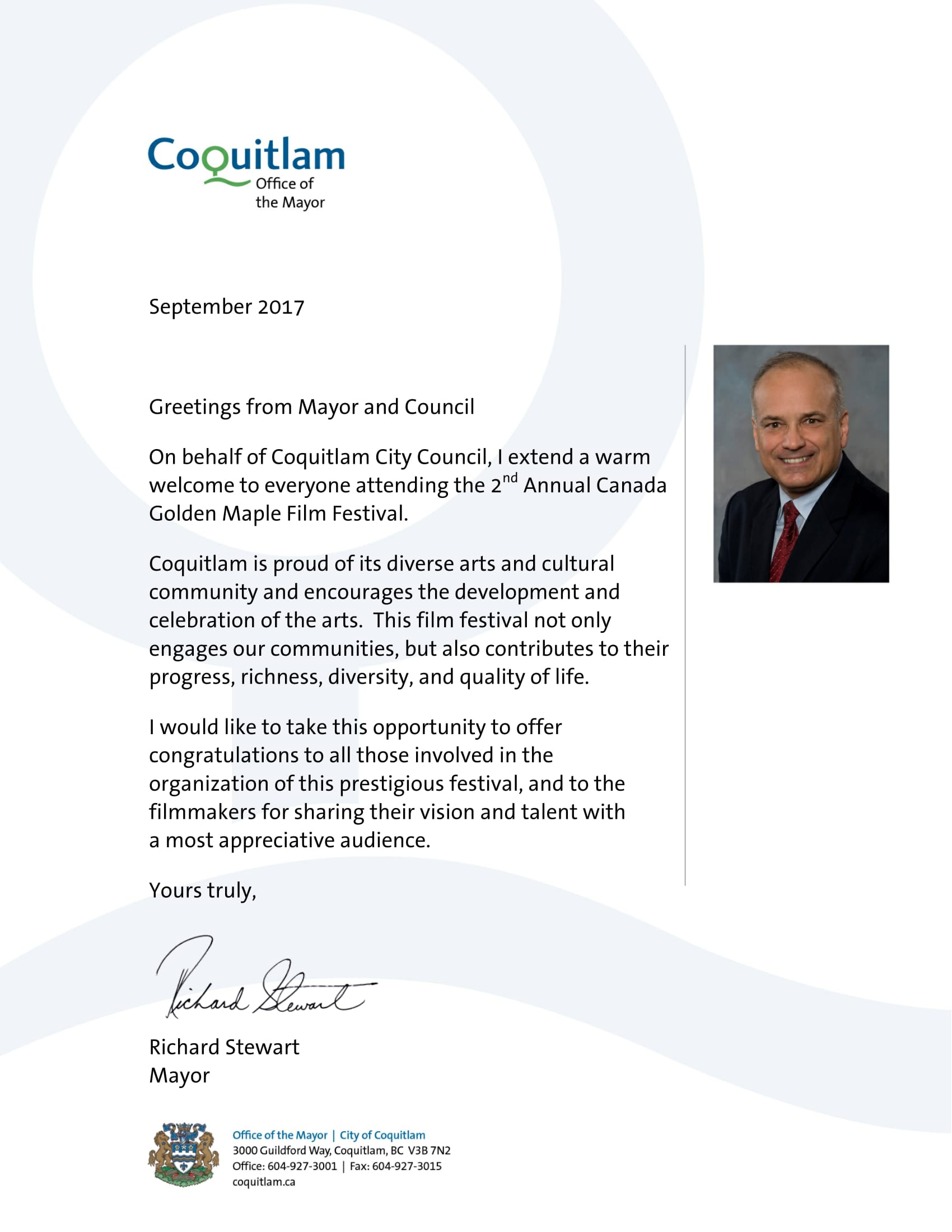 Congratulatory letter from Richard Stewart,the mayor of Coquitlam.2017-09-15 Congratulatory letter from Richard Stewart,the mayor of Coquitlam.