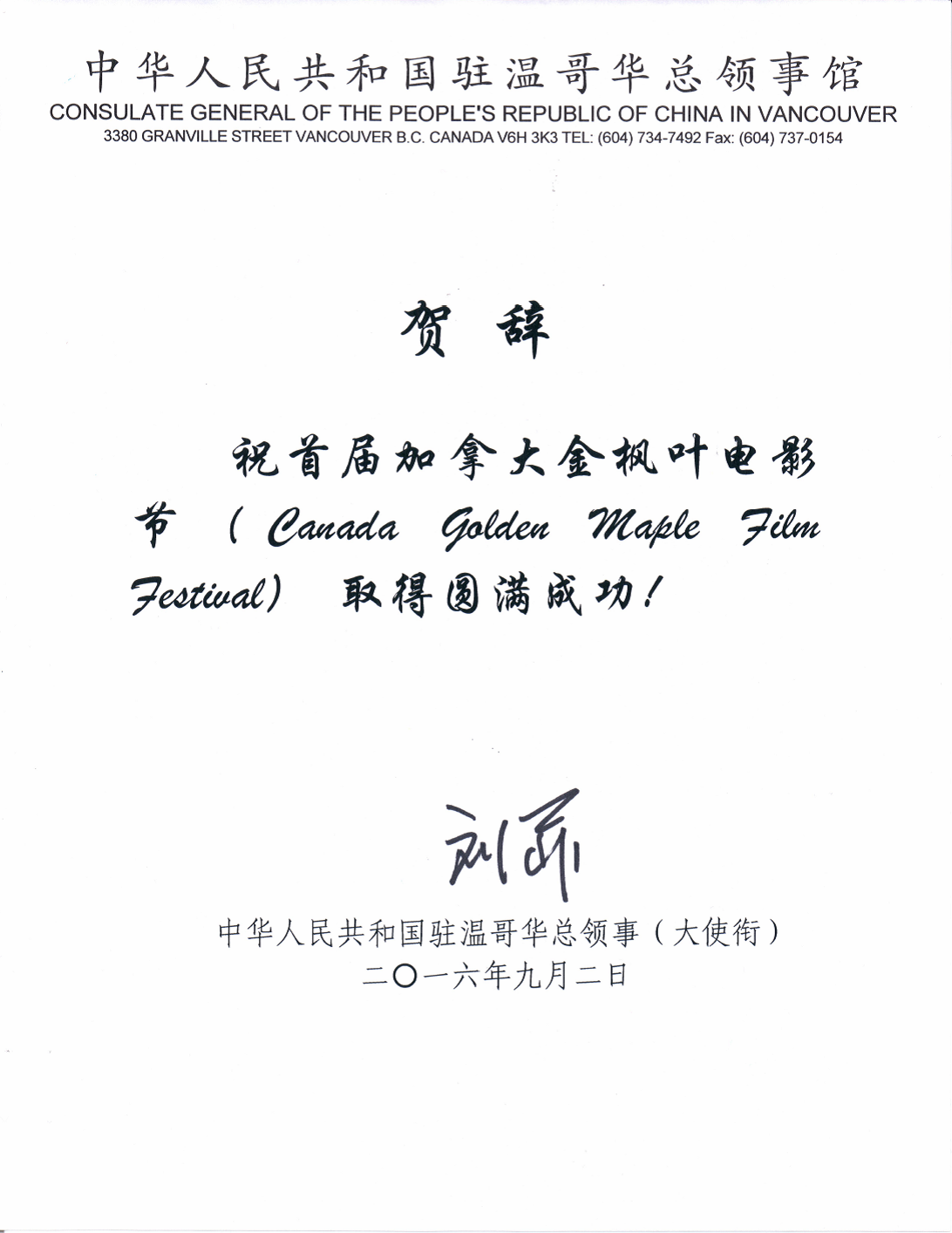 中华人民共和国驻温哥华总领事馆发来贺电,并预祝加拿大金枫叶国际电影节圆满成功2016-09-02
