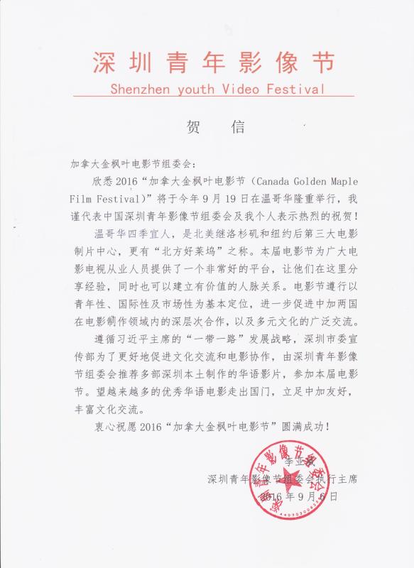深圳市影视产业联合会、深圳市电影电视家协会、深圳青年影像节组委会主席中国著名一级导演李亚威女士为加拿大金枫叶电影节发来祝贺信2016-09-05