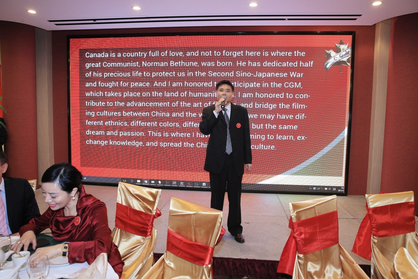 驻温哥华副总领事樊晓东致词表示,中国的电影近年来发展得非常迅速,在国际上不乏许多中国制作的有名好片。透过这个电影节,对促进中加两国人民间的沟通与了解,会起到非常重要的作用。借着这个平台,让双方更加了解对方的文化及各方进步的情形,进而深化双方人民间的交往。联邦国会议员苏立道致词时表示,加拿大总理最近访问了中国,更进一步加强了中加之间的经济、文化合作的力道,是中加友谊发展非常重要的一年,在此关键时刻举办电影节是非常有意义的。他对中国电影代表团能远道而来支持这个活动感到非常敬佩,同时代表杜鲁道总理颁发贺函给大会,祝大会圆满成功。卑诗省议会副议长李灿明致词特别强调,省政府对投资电影有特别的奖励政策,提供给电影劳工27%至35%的税务优惠,希望在座的电影从业人员能多多利用这个利机,多拍些好电影。媒体代表大华商报社长马在新致词时表示,电影透过现代科技给人类带来非常巨大的影响。2016年因着加拿大总理访问中国,已成为中加文化交流的关键年,电影节的举办,定将为加拿大的多元文化及宏扬中华文化增添新的光彩。中方代表团广州大学人文学院导师喩彬先生致词时首先称赞加拿大是一个可爱的国家,因为他被白求恩的伟大人道精神所感动。他表示,在这片充满人道主义的乐土上举办金枫叶电影节,「为中国的电影走向世界,为世界电影发扬光大」搭建一个无限宽广的平台,将不同语言、文化的人们聚集在一起,共同发展电影文化事业,是件非常了不起的工作。中国著名藏族歌手尕让邓真表示能来到这个可爱的地方与大家相聚是个缘份,他非常珍惜这个缘份。他祝福每部参展的作品都能获奖并希望透过电影节能让文化交流绽放出美丽的花朵。