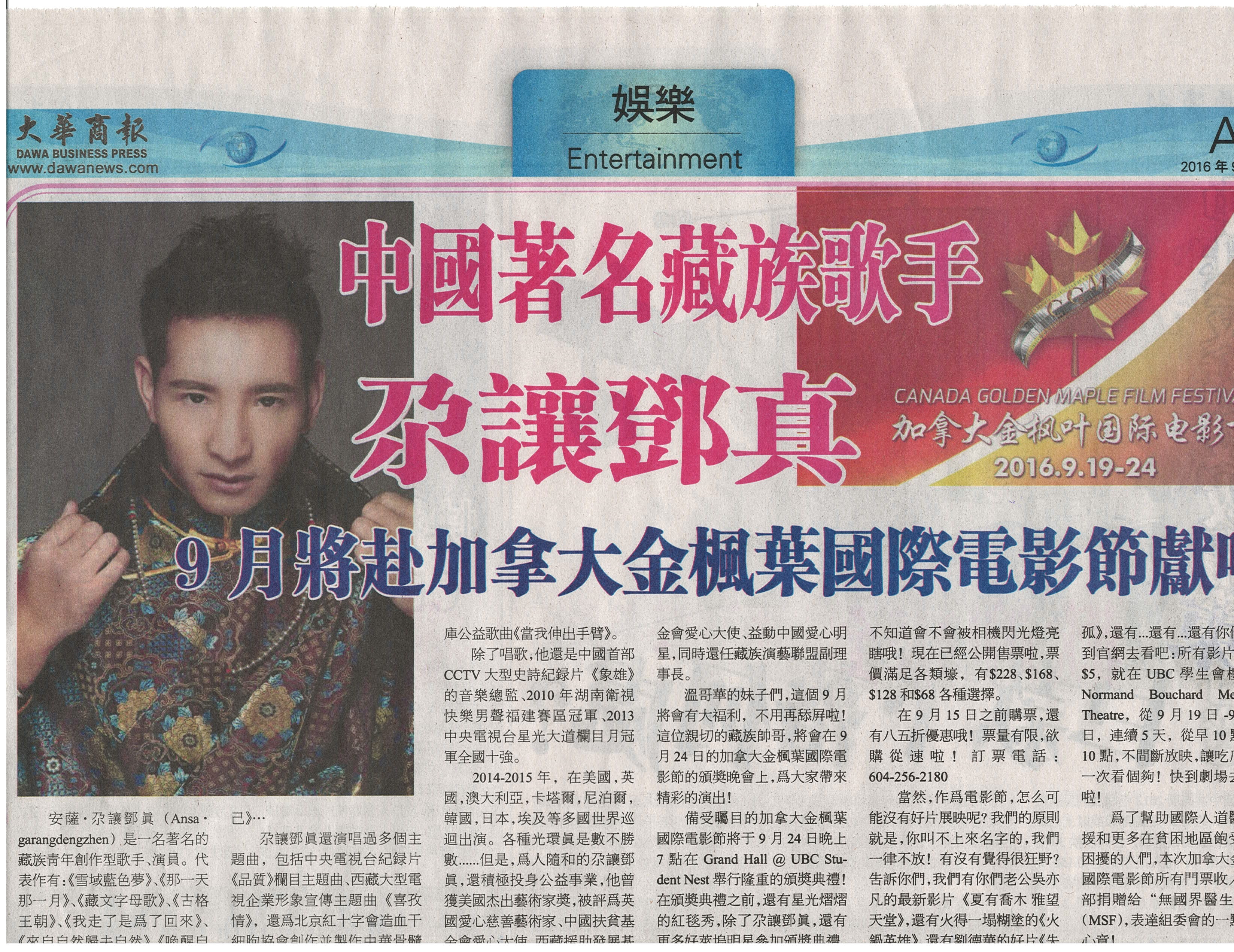 大华商报报道:中国著名藏族歌手尕让邓真9月将赴加拿大金枫叶国际电影节献唱