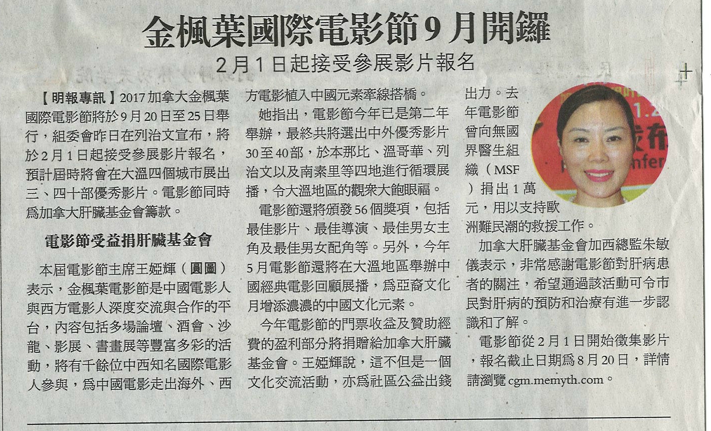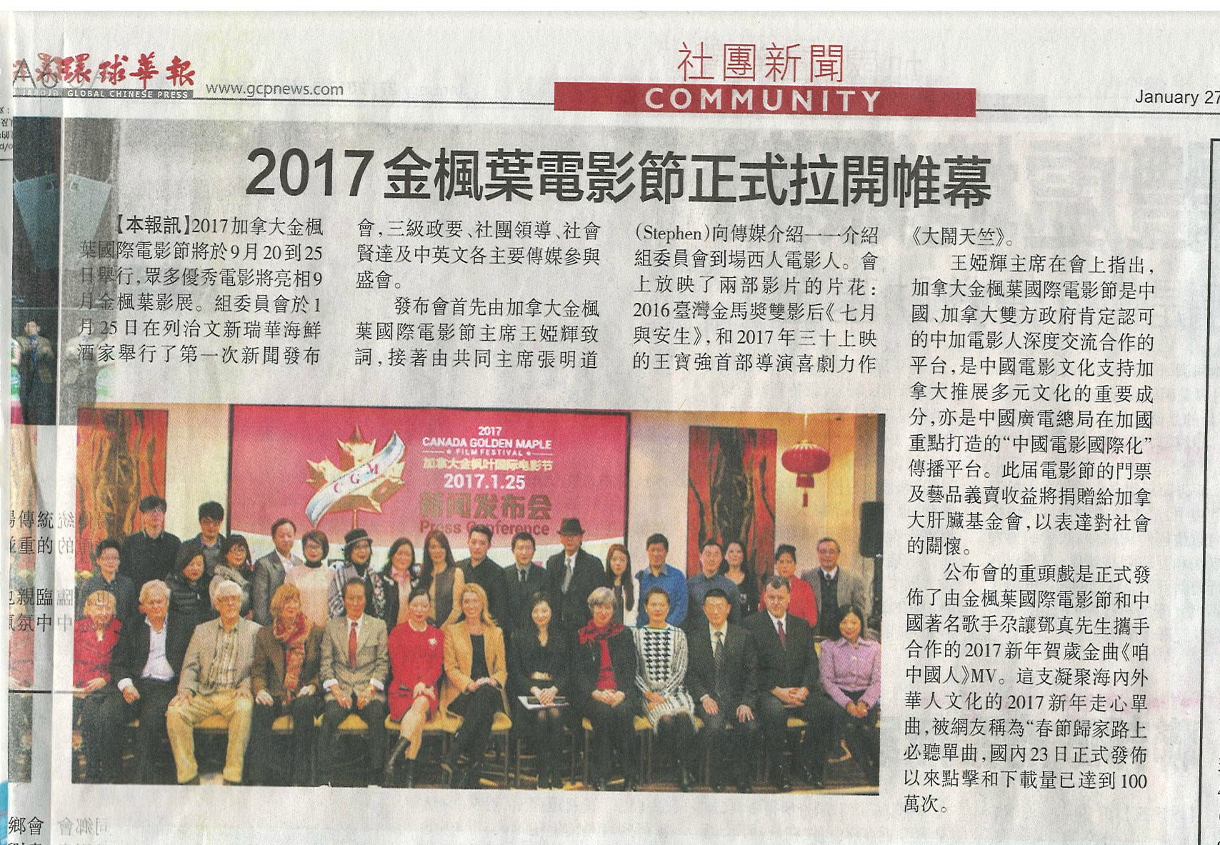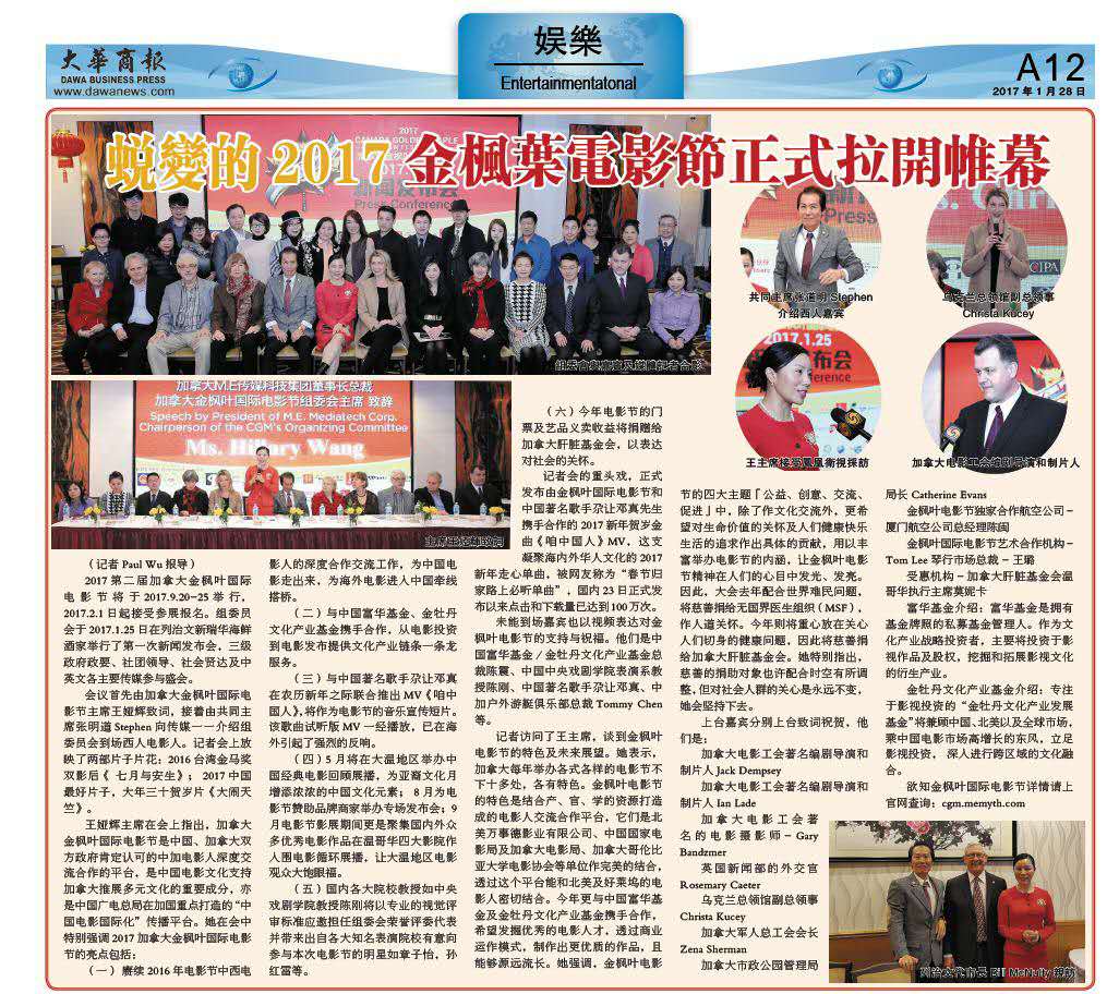 大华商报,环球华报,明报及星岛日报纷纷对2017年金枫叶国际电影节发表精彩报道2017-02-01