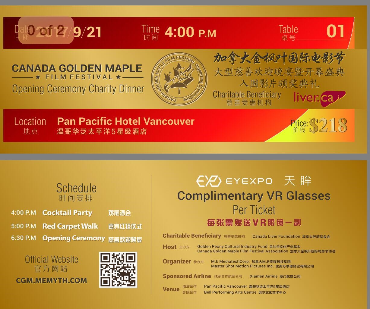 加拿大金枫叶国际电影节开闭幕典礼售票网站:https://cgm.memyth.com/zh_cn
