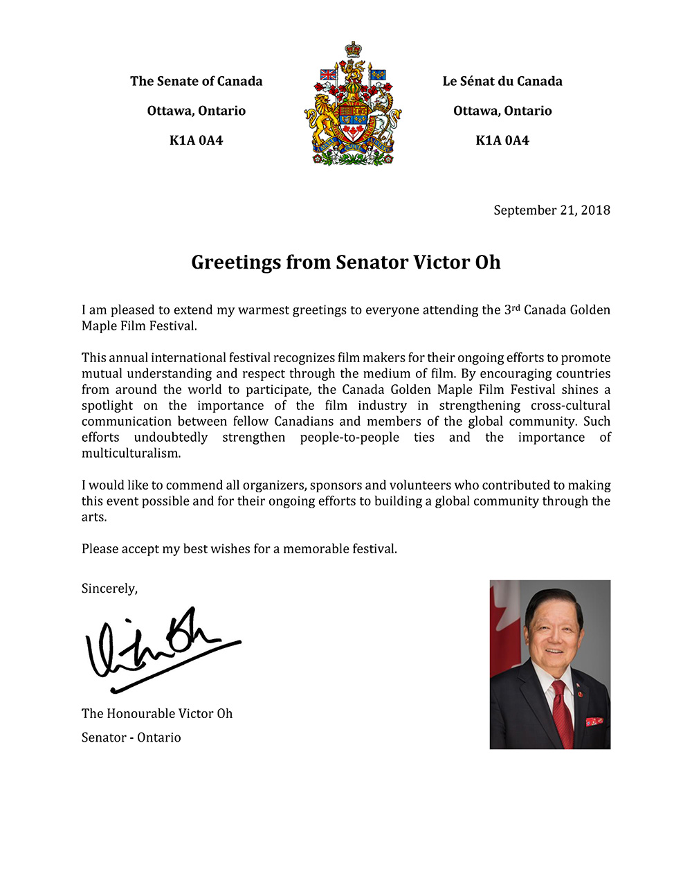 加拿大政府联邦参议员胡子修先生为金枫叶国际电影节发来祝贺信函2018-07-10