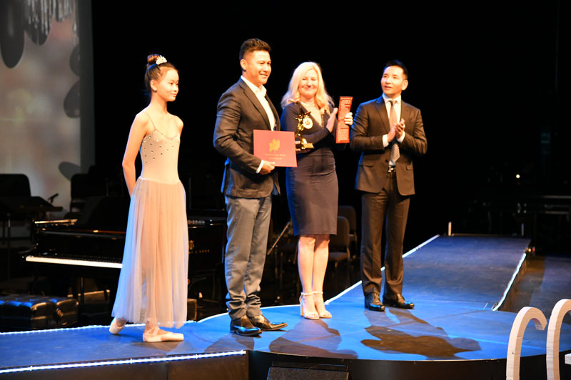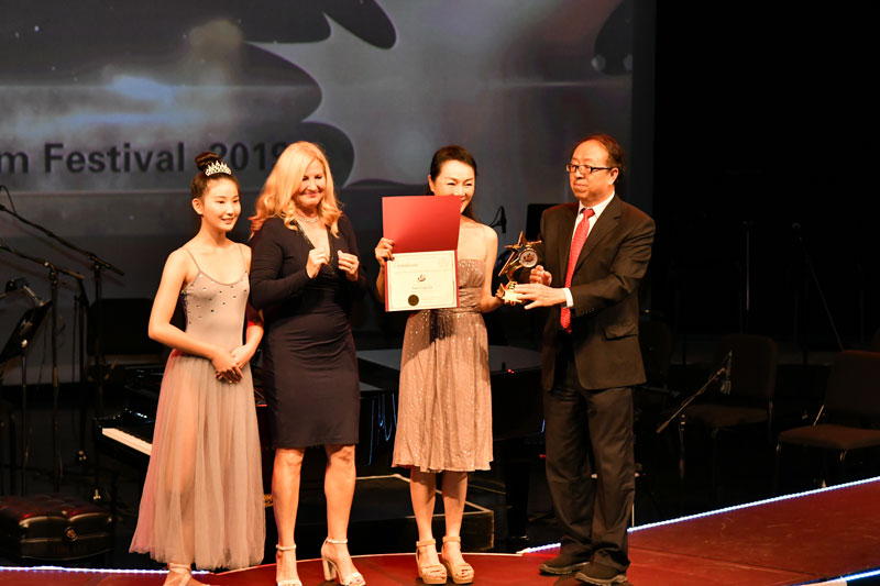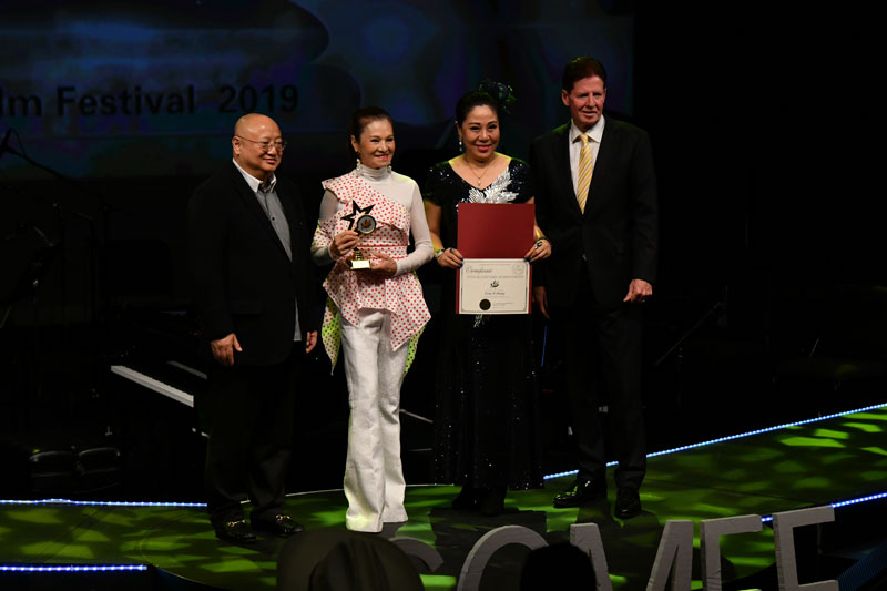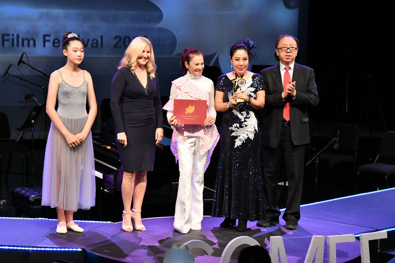 组委会特别大奖:张丰毅"电影终身成就奖"颁奖嘉宾:加拿大国防部女王钻石勋章获得者KAREN BAKER 女士联邦国会议员ALICE WONG女士,金枫叶国际电影节组委会主席Hillary Wang 共同颁发
