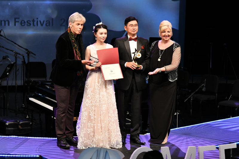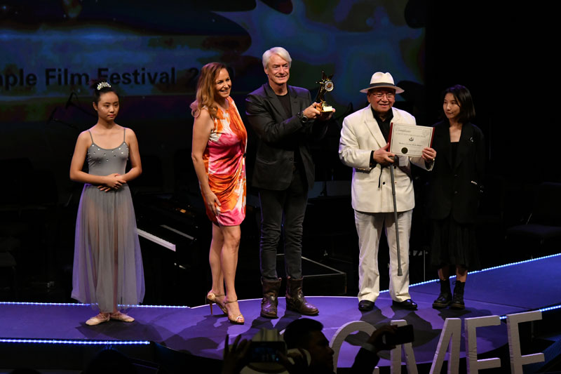 组委会特别大奖:张纪中“电影终身成就奖”颁奖嘉宾:美国著名导演Laurence 先生,金枫叶国际电影节组委会主席Hillary Wang ,组委会执行秘书长Zen共同颁发