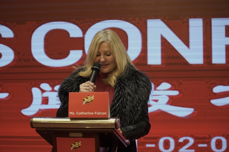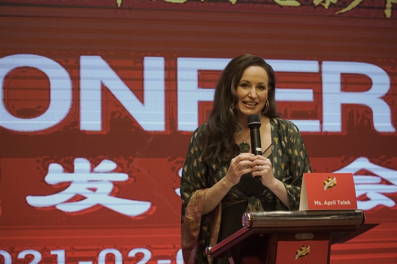 图为2021年2月8日第六界加拿大金枫叶国际电影节新闻发布会上加拿大资深电影演员,曾获13次提名,2017加拿大电影届LEO奖最佳女主角Ms.April Telek 代表专业评委团致辞