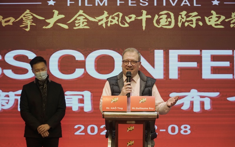 图为2021年2月8日 第六届加拿大金枫叶国际电影节新闻发布会上法国副总领事 Mr.GuillaumeRoy 代表法国电影届致辞